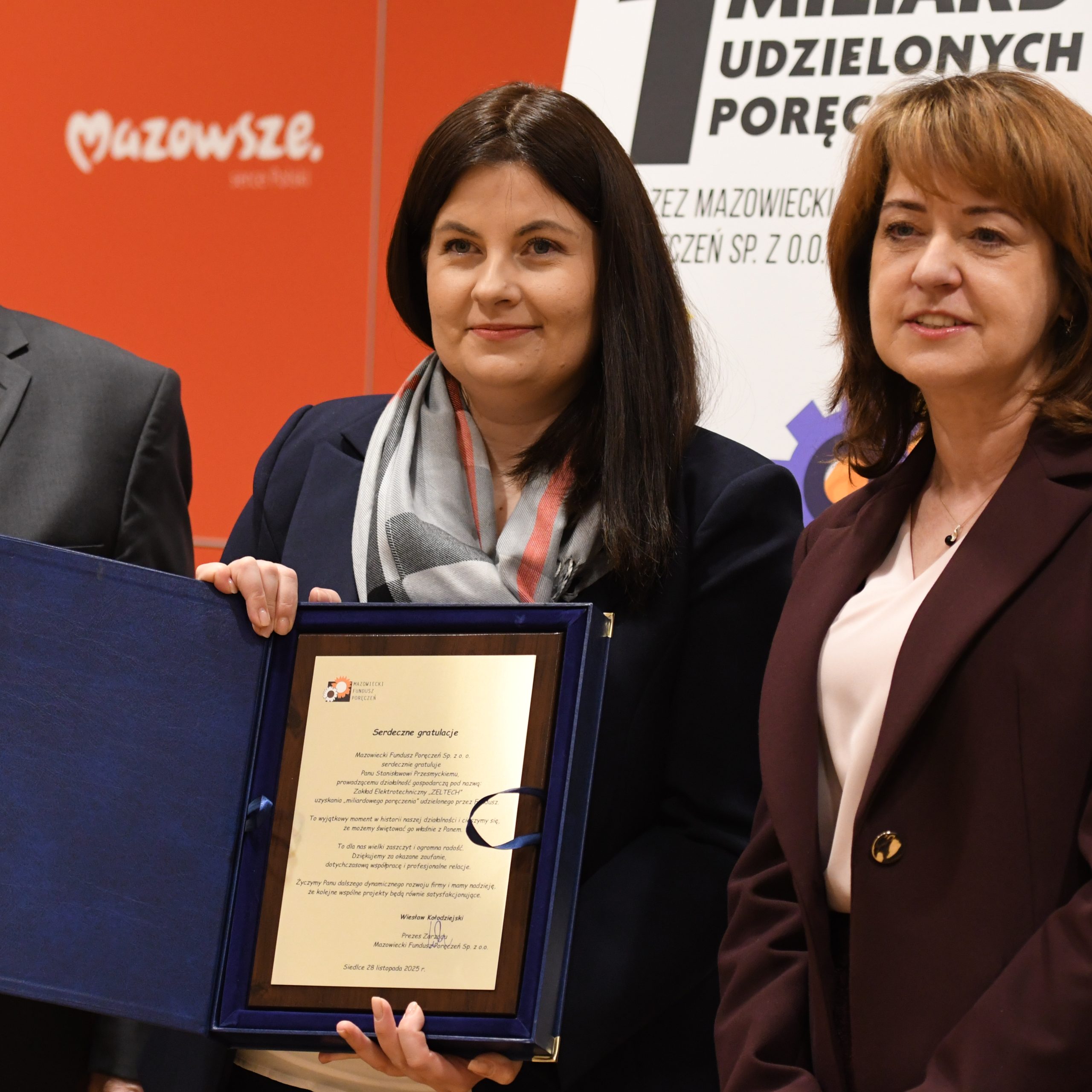 Szczególnym momentem konferencji było wręczenie podziękowań i gratulacji Firmie Zakład Elektrotechniczny Zeltech Stanisław Przesmycki uzyskania „miliardowego poręczenia” udzielonego przez Fundusz.